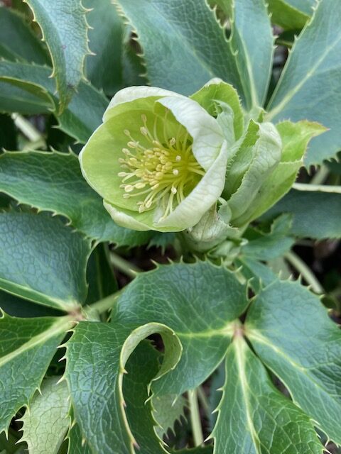 One plant that’s really bursting into life is the Corsican hellebore, a big toughie that thrives behind the low wall of the herbaceous border. Its shiny green leaves with a stylish serrated edge are so leathery they might make shoes! The many creamy flowers hang face down to keep the stamens dry for pollinators. Pollinators? In this weather?