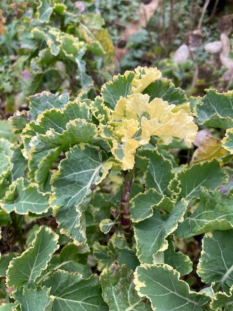 This plant is a perennial cabbage with variegated leaves. It’s tasty and more delicate than regular cabbage with a heart. You can make more plants by just sticking a shoot in the ground. A lovely, sustainable addition to our garden!