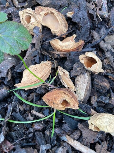 I came across some scattered plum stones from our autumn crop. A hungry vole has been nibbling away the hard shells to get at the nutritious seeds inside. It’s such a treat to see one of our wee rodents; they are very cute.